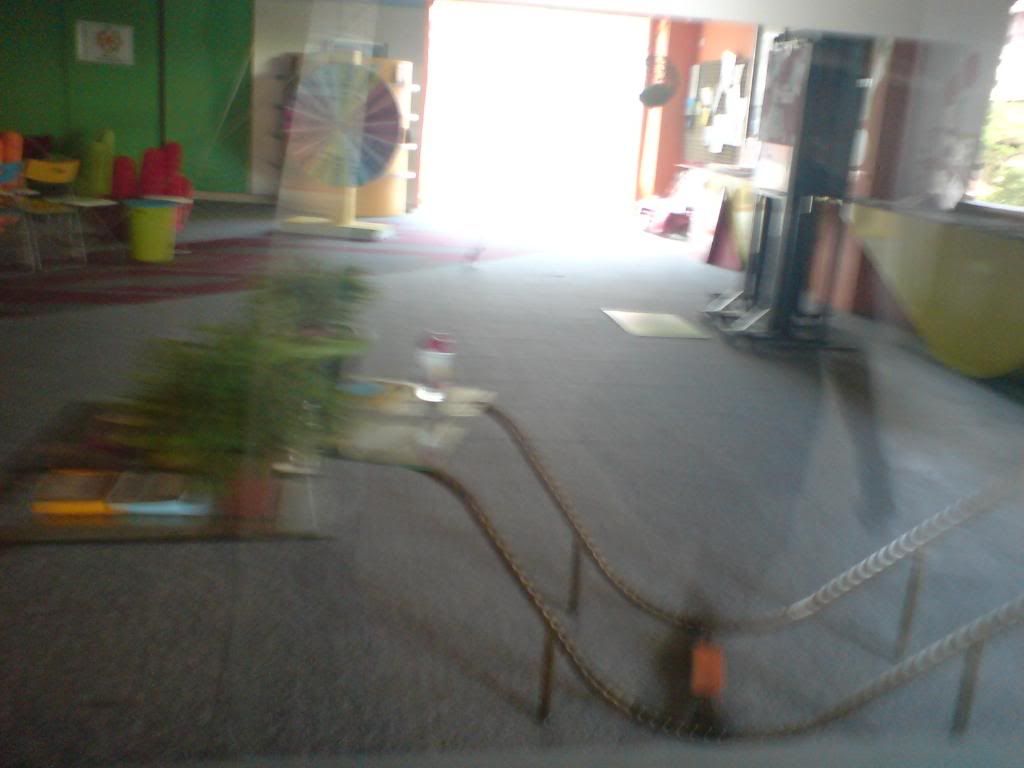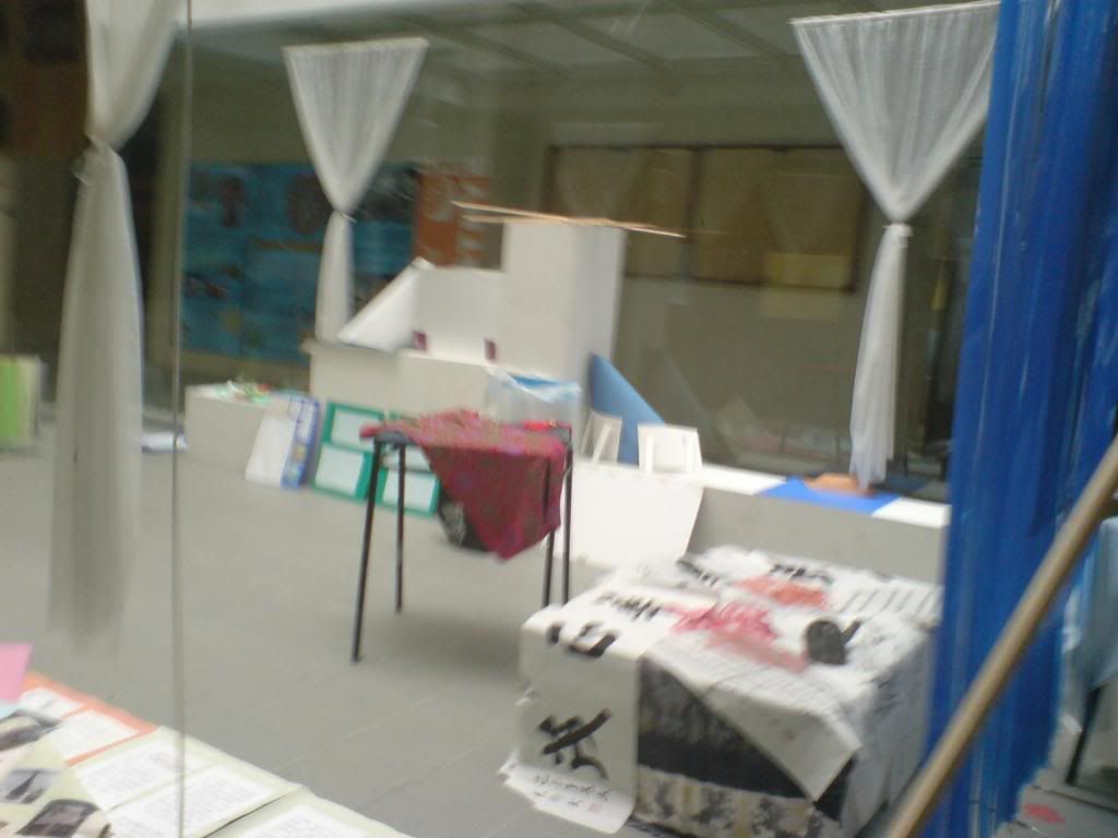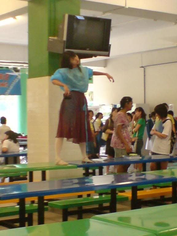 Here's the bright and colourful canteen and standing on the table is one of the drama club members. She's actually Mrs Tan's (previous principal) daughter. I think they look kinda alike. :)