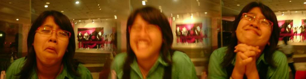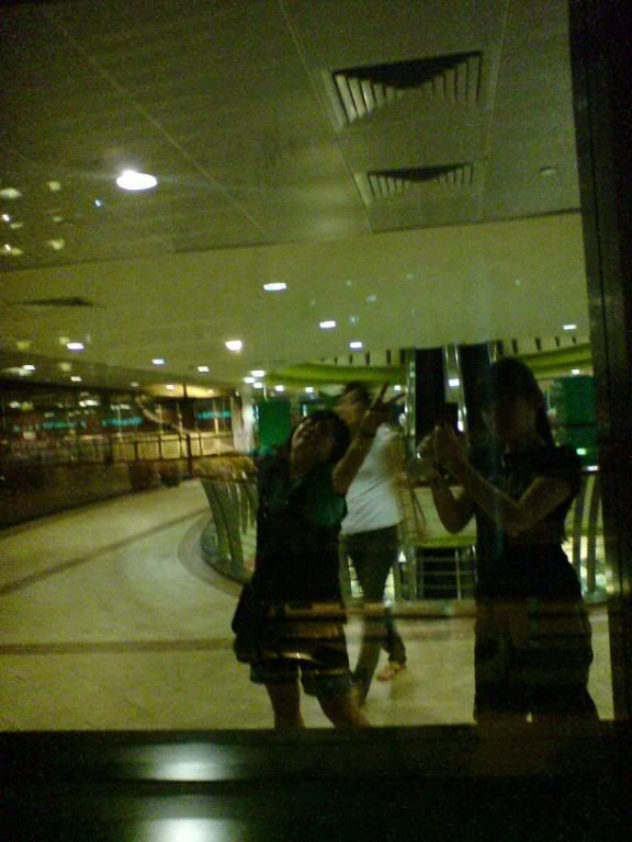 Naomi was doing some exaggerated pose so I could at least capture her shadow. Actually I think we can be seen if we take a photo further away from the panes. You can see Sokmui in white in this photo. It's because we crowd too near the pane and block out the light, that's why.